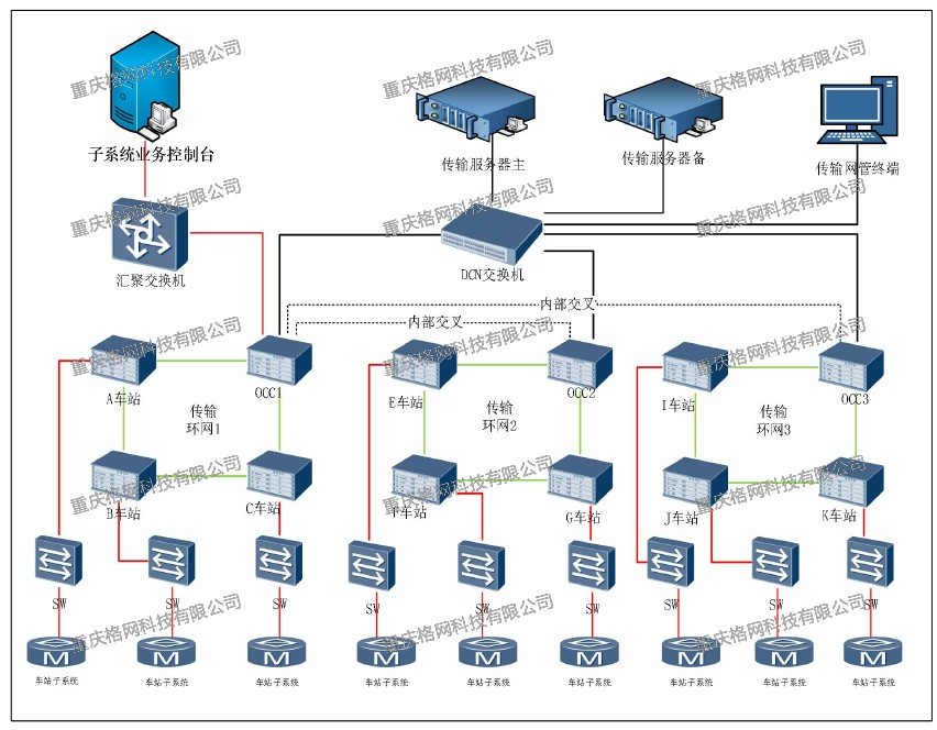 车站各子系统(票务、信号、监控、办公网等)通过传输网络汇聚到控制中心。