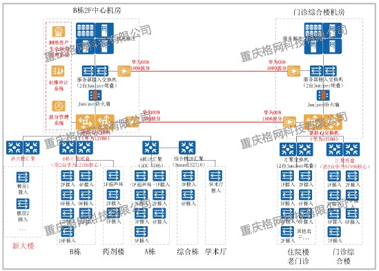 妇幼保健院新医院建设,网络实现虚拟化,核心到汇聚实现全万兆,新老机房实现业务双活。