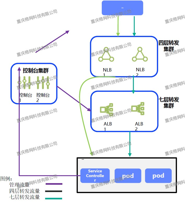 流量转发时根据业务特征区分转发路径。四层流量经过NLB直接转发到Pod,七层流量通过NLB转发至ALB集群,再转发到Pod。